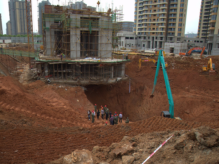 5月2日上午10時(shí)50分,江夏區(qū)文化大道江南新天地一在建樓房工地發(fā)生地面塌陷事故,兩名工作人員和一臺勘察鉆機(jī)被埋。我院受市建委委托,在肖建華院長的指示下,迅速組織地災(zāi)、物探等相關(guān)專業(yè)專家,組成應(yīng)急救援隊(duì)伍,數(shù)次奔赴現(xiàn)場參與應(yīng)急救援工作。