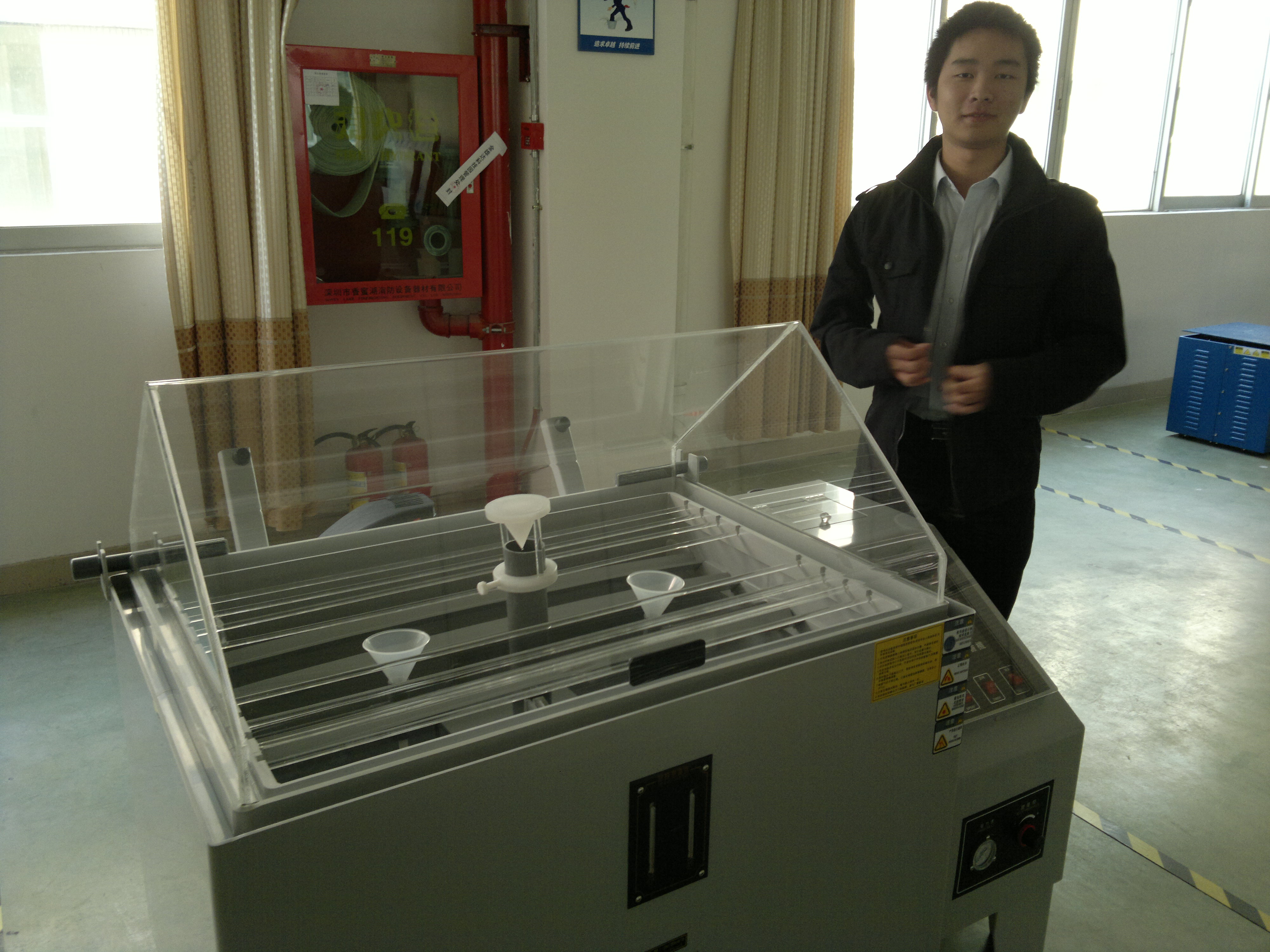 3、收集器:噴嘴所噴出的細霧,以自由落體方式沉降,內(nèi)置一個或數(shù)個表面積80cm2的漏斗杯收集鹽霧,凝結(jié)成水后由導管流至箱體外部的計量筒內(nèi);